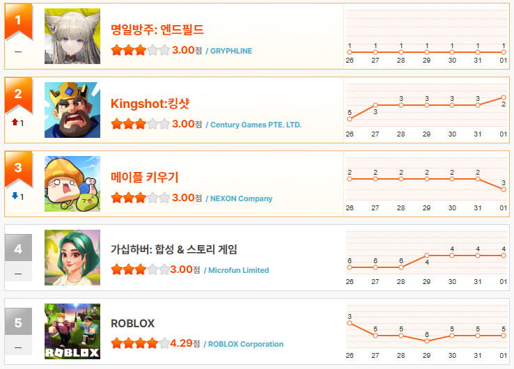1월 4주차 헝그리앱 랭킹에서는 지난주 왕좌에 오른 ‘명일방주: 엔드필드’가 흔들림 없이 1위를 지키며 본격적인 독주 체제에 들어섰다. 1월 3주차 28위에서 단숨에 정상까지 치고 올라온 이후, 열기는 식지 않는 모습이다. 글로벌 3,500만 사전등록자 규모에 걸맞게 PC·콘솔·모바일을 아우르는 대형 신작의 저력을 그대로 증명했다.