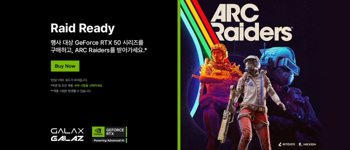 그래픽카드 전문 제조기업 갤럭시 마이크로시스템즈(Galaxy Microsystems Ltd.)의 한국 지사인 갤럭시코리아는 2025년 10월 7일부터 2025년 11월 4일까지 갤럭시 GALAX 및 GALAZ GeForce RTX 5080, RTX 5070 Ti, RTX 5070 그래픽카드 또는 해당 제품이 탑재된 완제 PC 구매 고객을 대상으로, ‘아크 레이더스(ARC Raiders)’ 게임 번들을 증정하는 프로모션을 진행한다고 밝혔다.