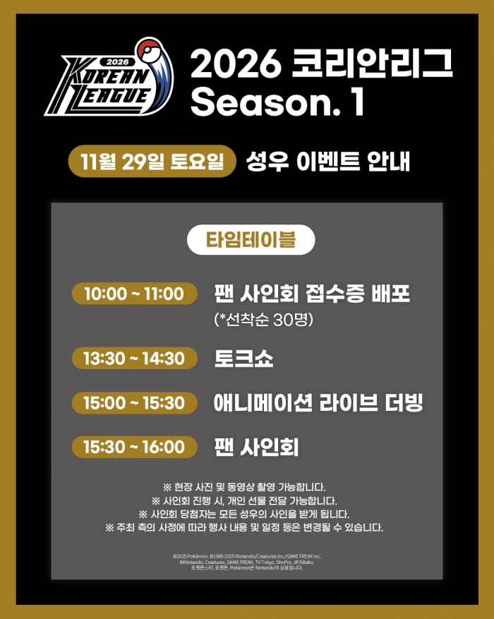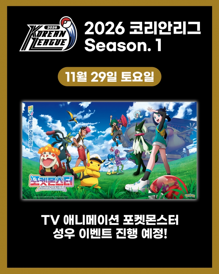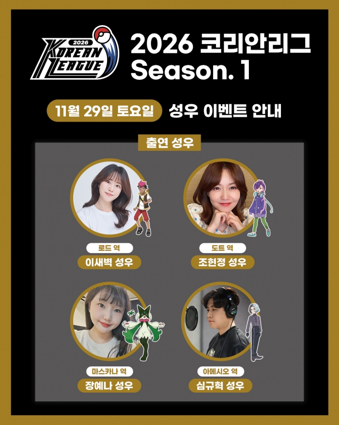 이번 이벤트는 개막일인 오는 29일 토요일에 진행되며, ‘2026 코리안리그 시즌1’ 개막을 기념해 ▲로드 역 ‘이새벽’ ▲도트 역 ‘조현정’ ▲마스카나 역 ‘장예나’ ▲아메시오 역 ‘심규혁’ 총 4명의 TV 애니메이션 포켓몬스터 시리즈에서 큰 사랑을 받은 성우들이 출동한다.