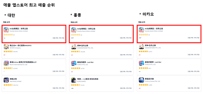 RO선경전설: 세계지려는 론칭 하루 전 오픈한 사전 다운로드에서부터 대만∙홍콩∙마카오 3개 지역 애플 앱스토어 인기 게임 1위를 기록하며 뜨거운 관심과 기대를 입증했다. 론칭 이후에는 애플 앱스토어 게임 최고 매출 순위도 3개 지역 모두 1위를 달성하며 초반 흥행에 성공했다. 특히 전체 앱 순위에서도 3개 지역 무료 다운로드 1위와 함께 매출 순위 대만, 마카오 1위, 홍콩 3위에 이름을 올려 라그나로크 IP의 폭발적인 인기를 실감케 했다.
