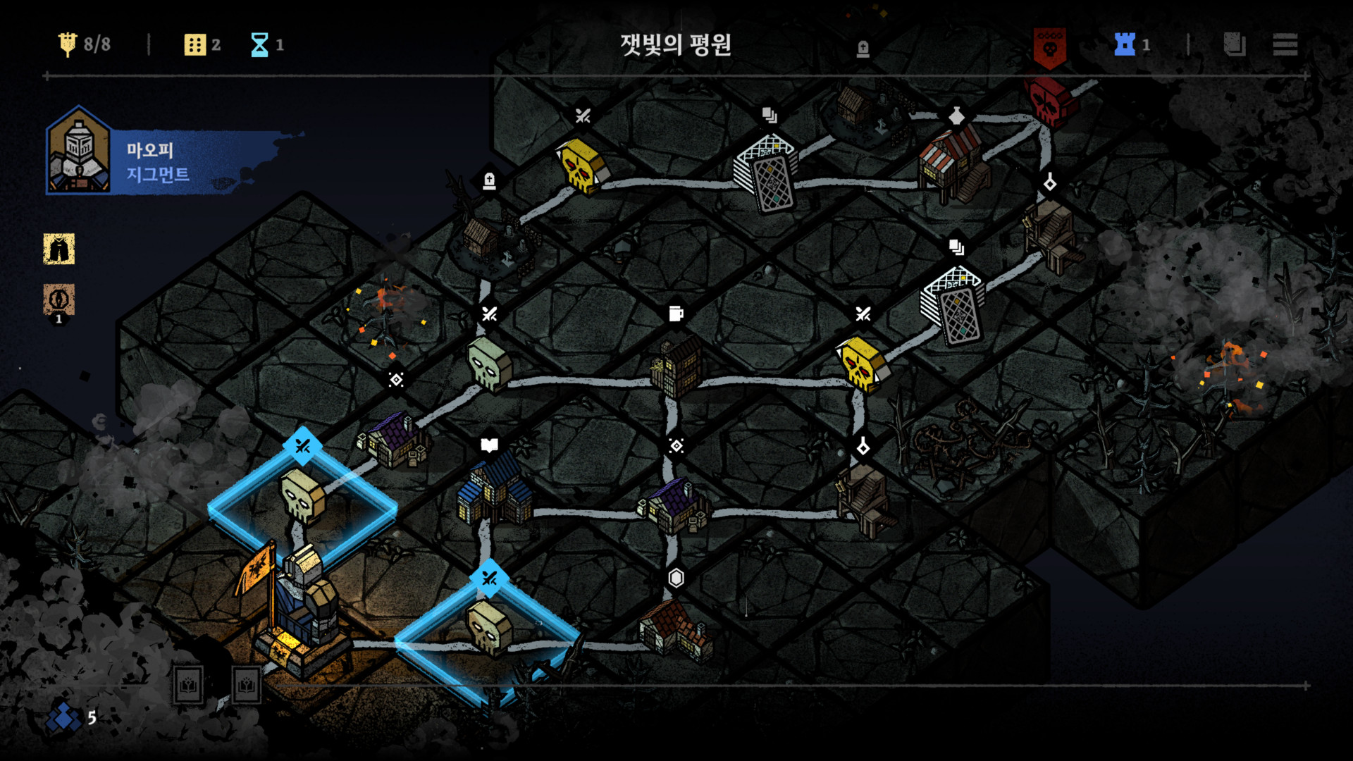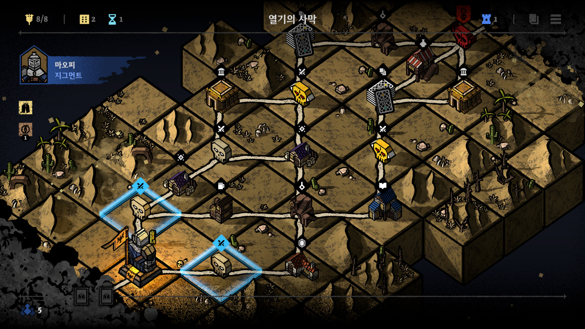 각 지역에 위치한 다양한 건물을 방문해 용병의 특성을 조합하고, 원정대 라인업을 정비하며, 유물과 아이템을 구입해 다가올 전투에 대비할 수 있다.