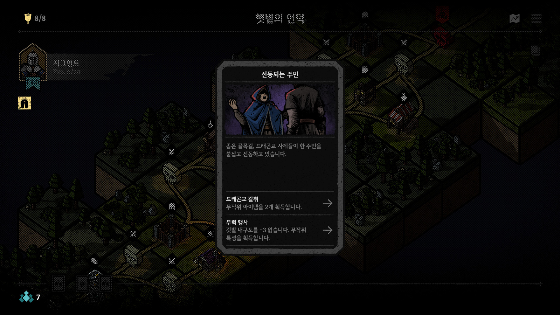 전투 외에도 여정 중에는 카드 이벤트가 무작위로 발생한다. 여정 도중 펼쳐지는 짧은 이야기와 함께 플레이어의 선택에 따라 서로 다른 결과가 전개되는 구조다. 이러한 선택이 원정대에 이득이 될지, 혹은 위기가 될지는 전적으로 플레이어의 판단에 달려 있다.