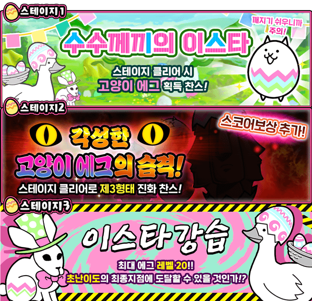 이와 함께 이벤트를 기념한 다양한 한정 스테이지도 공개된다. ‘수수께끼의 이스타’ 스테이지를 클리어하면 일정 확률로 한정 캐릭터 ‘고양이 에그’를 획득할 수 있으며, 이어지는 ‘각성한 고양이 에그의 습격!’ 스테이지를 통해 해당 캐릭터를 제3형태로 진화시킬 수 있다. 또한 진행할수록 난이도가 상승하는 ‘이스타 강습!’ 스테이지도 함께 운영돼 도전 요소를 강화했다.