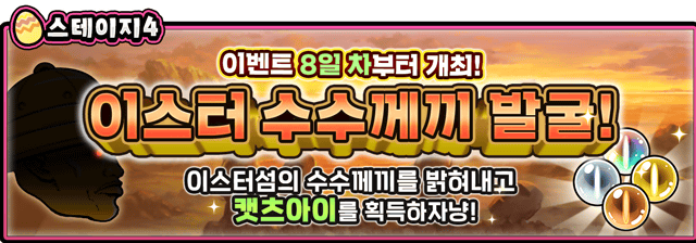 이벤트 8일 차부터는 추가 콘텐츠도 열린다. ‘이스터 수수께끼 발굴!’ 스테이지가 새롭게 등장하며, 이를 클리어하면 성장에 필요한 ‘캣츠아이’를 획득할 수 있다. 해당 스테이지는 5월 4일(월) 11시부터 5월 11일(월) 10시 59분까지 이용 가능하다.
