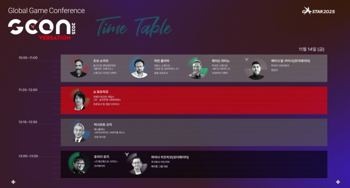 “기술과 예술, 산업과 창작이 교차하는 새로운 형태의 글로벌 컨퍼런스로 도약하겠다”고 밝혔다. 이번 G-CON의 양일간 시간표는 지스타 웹사이트를 통해 확인할 수 있다.