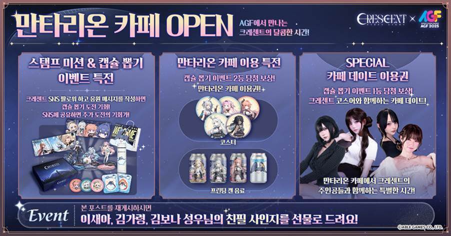 특히 출시 전 소식을 가장 빠르게 확인할 수 있는 SNS 팔로우 이벤트, 그리고 크레센트 응원 메시지월 작성 이벤트에 참여하면, 부스 콘셉트에 맞춘 카페 이용권과 코스어와 함께하는 카페 데이트 체험 기회가 제공된다.