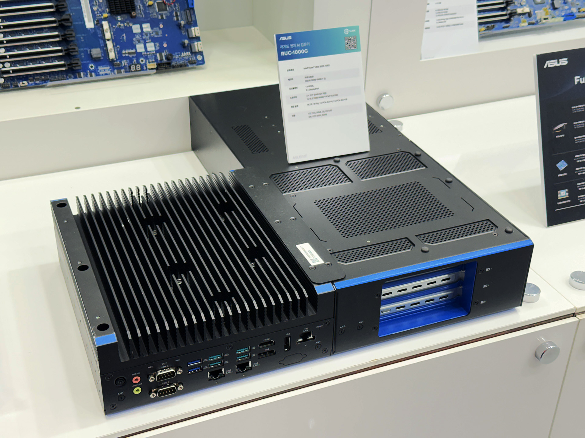 에이수스 RUC-1000G는 2U 폼팩터에 600W GPU를 지원하여 최대 4,000 TOPS의 AI 성능을 보여주는 러기드 랙 엣지 AI GPU 시스템이다. PCIe 5.0를 기반으로 빠른 데이터 처리, 인텔 코어 울트라 200S 시리즈 프로세서를 탑재해 고성능을 보여줄 뿐만 아니라 메인 시스템과 GPU 섀시를 분리하여 관리하는 냉각 시스템을 적용해 가혹한 환경에서도 일관된 성능을 보여준다. 또한 MIL-STD-810H 인증으로 높은 내구성, 10GbE, 2.5GbE 등 다양한 I/O와 원격 모니터링을 위한 iBMC 모듈을 지원해 고성능 산업용 AI 컴퓨팅에 최적화되어 있다.