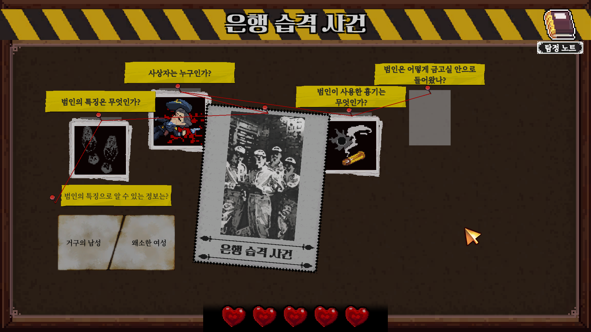 - 탐정 보드: 사무실로 돌아가 탐정 보드 위에 증언과 물증을 연결하고 사건의 타임라인을 재구성하라! 흩어진 단서들이 하나로 모이는 순간, 진범이 드러난다.