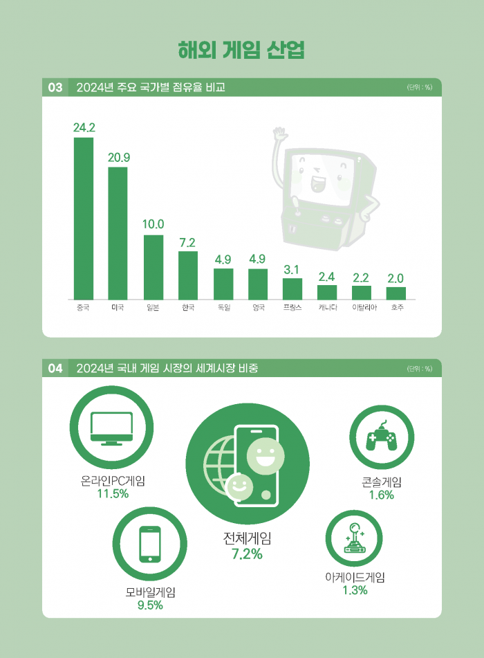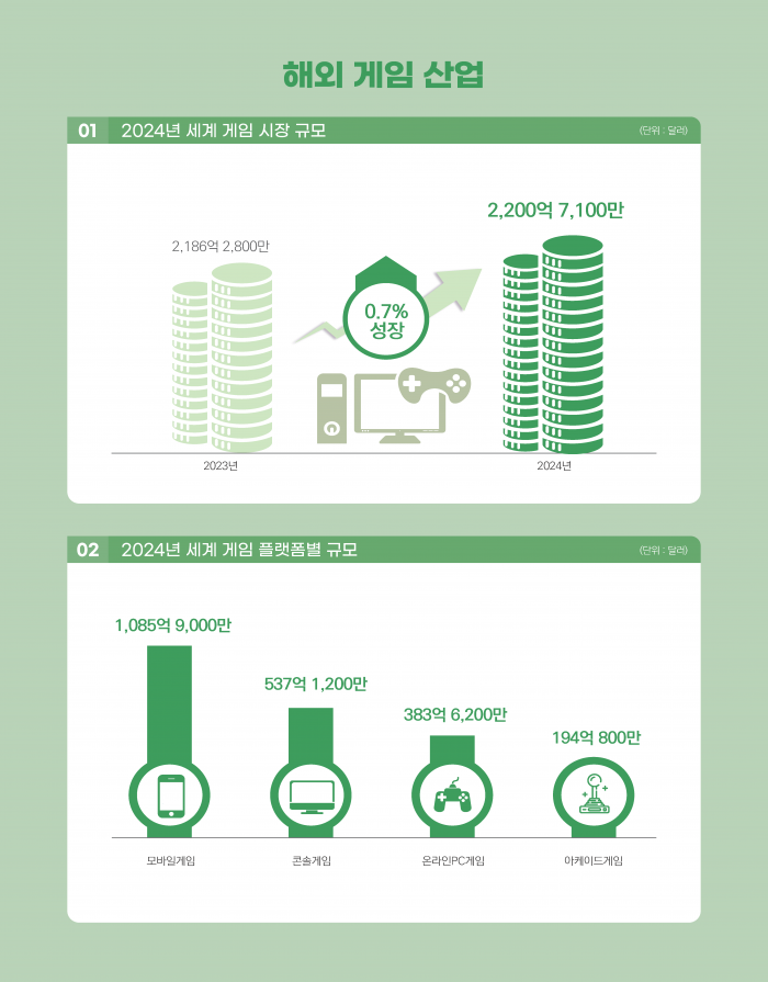 2024년 세계 게임시장 규모는 전년 대비 0.7% 증가한 2,200억 7,100만 달러 수준으로 추산된다. 한국 게임산업의 세계 시장 점유율은 7.2%로 중국, 미국, 일본에 이어 4위를 유지했다.