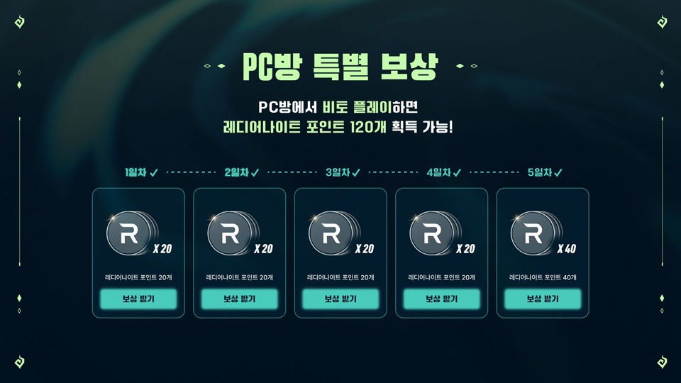 비토의 출시를 기념해 오는 28일(일)까지 ‘비토 출석체크 이벤트’가 진행된다. 이번 이벤트는 집이나 PC방 어디서든 하루 한 번만 플레이하면 참여가 가능하며 일반전, 경쟁전, 신속 플레이 모드에서 모두 참여할 수 있다. 이벤트 참여자들은 누적 출석 일수에 따라 다양한 선착순 보상을 받을 수 있다. 특히 PC방에서 참여 시 최대 120개의 레디어나이트 포인트를 추가로 획득할 수 있으며 비토 출시를 기념한 한정판 굿즈와 게임 내 아이템 쿠폰, 게이밍 기어등 풍성한 보상이 준비되어 있다.