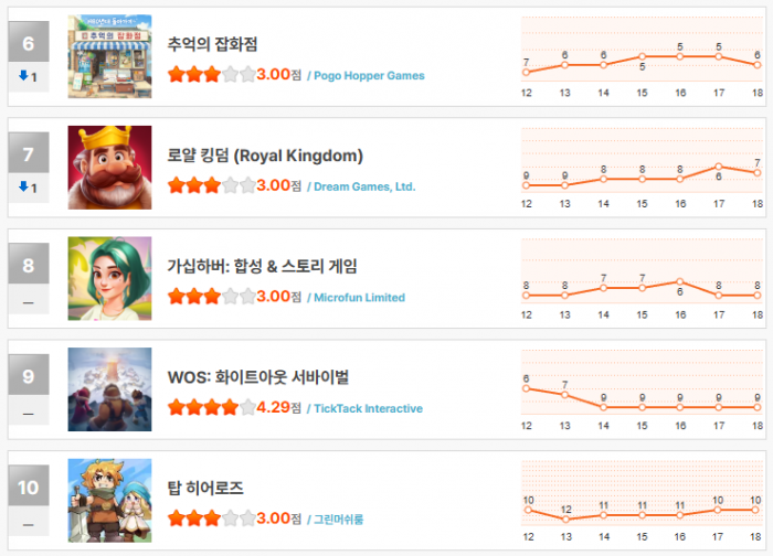 중위권에서는 ‘로얄 킹덤’이 7위로 소폭 반등했고, ‘가십하버: 합성 & 스토리 게임’은 8위로 하락세를 이어갔다. ‘탑 히어로즈’는 끈질긴 업데이트와 유저 복귀 효과로 TOP10의 문턱을 굳건히 지켜내고 있다.