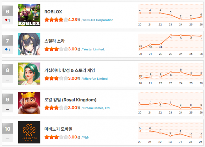 그 사이 37게임즈의 ‘와다다 던전런’은 잠시 2위까지 오르며 화제를 모았지만, 대작 러시에 밀리며 4위로 후퇴했다. 반면, 요스타의 ‘스텔라 소라’는 45위에서 최대 4위까지 상승했다가 현재 7위에 안착했다.