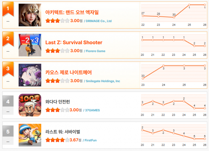 신규 진입작 중 또 하나의 주목할 작품은 스마일게이트의 ‘카오스 제로 나이트메어’다. 33위에서 3위까지 치솟으며 아키텍트에 필적하는 상승세를 보였다. ‘에픽세븐’의 개발진이 만든 다크 판타지 로그라이크 RPG로, 카드 기반 덱 빌딩 전투 시스템과 독창적인 세계관이 유저들에게 “에픽세븐의 어둠 버전”이라는 평가를 받고 있다.