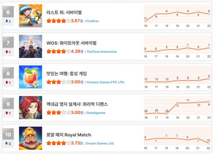 중위권에서는 순위 변동이 더욱 활발했다. ‘라스트 워: 서바이벌’은 한 계단 하락해 6위로 내려앉았고, ‘WOS: 화이트아웃 서바이벌’은 다시 한 계단 상승하며 7위에 자리했다. ‘맛있는 여행: 합성 게임’은 소폭 상승해 8위로 올라, 캐주얼 합성 장르의 꾸준한 수요를 확인시켰다.
