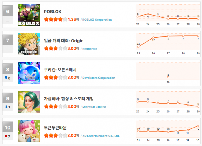 상위권에서는 ‘스톤에이지 키우기’가 1위를 유지하며 견고한 인기를 증명했으나, 바로 뒤를 추격하는 ‘라스트 어사일럼: 페스트’의 상승 기세가 만만치 않아 향후 정상 경쟁 구도에도 변화가 예상된다. ‘메이플 키우기’ 역시 꾸준히 3위를 유지하며 고정적인 팬층의 지지를 확인했다. 반면 ‘두근두근타운’은 10위권에 다시 진입하며 저력을 과시하는 데 성공했다.