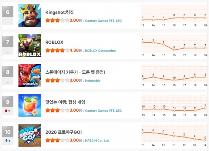 ‘킹샷’은 6위에 머물며 다소 힘이 빠진 모습을 보였고, ‘로블록스’는 7위로 소폭 하락했다. 한때 상위권을 위협하던 작품들이지만, 최근 신작 공세 속에서 점차 존재감이 옅어지는 흐름이다. ‘스톤에이지 키우기’ 역시 8위에 머무르며 하락세를 벗어나지 못하고 있다. 한때 1위를 차지했던 작품이라는 점을 감안하면, 분위기 반전이 필요한 시점이다.